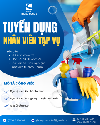 Mô tả công việc nhân viên tạp vụ: Dọn về sinh khu hành chính Dọn về sinh trong dây chuyền sản xuất Giặt ủi đồ BHLĐ Yêu cầu: Nữ, sức khỏe tốt Độ tuổi từ 20-45 tuổi Ưu tiên có